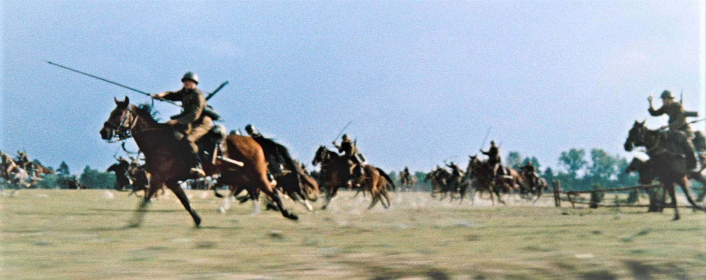 Wajda clearly saw it as a great Romantic-tragic image, his inspiration fired up by the popular saying “with swords against tanks” (“z szablami na czołgi”)—an English equivalent might be “to bring a knife to a gunfight”—but the problem was that such an encounter never actually happened, or at least not in the way that Wajda so vividly depicted it. The real-life inspiration happened on 1st September 1939, the day of the German invasion of Poland, in which the 18th Pomeranian Uhlan Regiment executed a successful surprise charge on a battalion of German infantry in the village of Krojanty, but when armoured cars emerged from the nearby Tuchola Forest they were forced to retreat. Although it was a pretty even-handed encounter until the armoured cars arrived, German and Italian propagandists quickly turned it into a powerfully anti-Polish narrative in which heroic but backward Polish uhlans were sent on suicide missions against German tanks by their callous incompetent superiors.